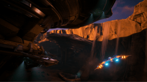 Many of the new locations in Wrath of the Ancients strongly shaped the sound identity of the expansion. On the desert planet Khormot Cenotap, the wind can carry the distant, haunting calls of massive exotic creatures, rare enough to spark curiosity. Flying over open dune fields surrounds your ship with wide, barren wind textures. Threading through sand canyons adds the tactile patter of fine grains cascading across the hull and wings. Inside ancient temple ruins, the outside winds become filtered and hollow, blending with faint rustling, stone crackles, and the whisper of shifting sand.